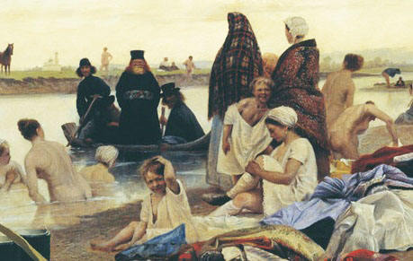 Сюжет картины, написанной в 1870-е годы, – женщины устроили купание в реке: кто-то раздевается, кто-то заходит в воду. В центре — оторопевшие монахи в лодке, которую принесло к купальщицам течение. Иноки помоложе застыли с веслами в руках, а пожилой пастырь улыбается, дескать: «Ну вот, приплыли!». Учитывая религиозность Соловьёва, сюжет его этой картины и особенно образы монахов выглядят несколько странно. Как-то уж очень откровенно они смотрят на купающихся женщин, ни один даже не отвернулся.