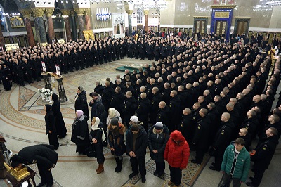 Чтобы заполнить пространство собора, на службу привели курсантов, но две третьих из них стояли к алтарю боком.