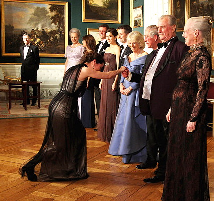 2012 год: Голливудская актриса приветствует церемониальным книксеном великобританского Принца Чарльза среди других монархических персон Королевских Домов Европы