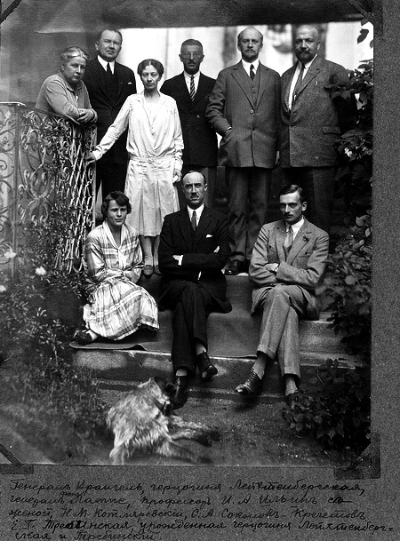 Генерал Врангель в кругу друзей во время встречи в замке Зеон. Сидят (слева направо): Елена Георгиевна Трибинская (урожденная герцогиня Лейхтенбергская), барон Петр Николаевич Врангель (1878–1928), Аркадий Константинович Трибинский. Стоят: герцогиня Ольга Николаевна Лейхтенбергская, Николай Михайлович Котляревский (секретарь ген. Врангеля), Наталья Николаевна Ильина, Сергей Алексеевич Соколов-Кречетов (директор издательства «Медный Всадник»), Иван Александрович Ильин, Алексей Александрович фон Лампе (1885–1967). 2 июля 1926 года